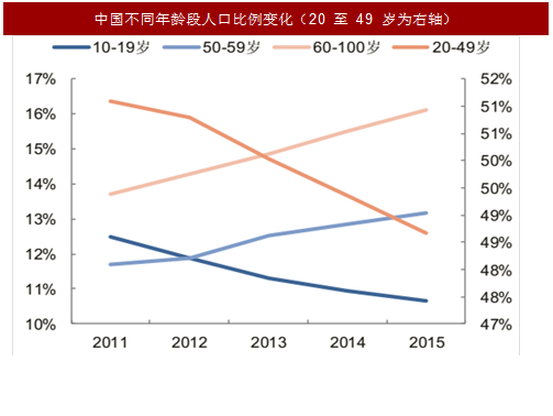 近年來,中國人口結(jié)構(gòu)發(fā)生顯著變化,可工作人口數(shù)量明顯減少。我們將 20 至 60 歲年齡段的人群視為有勞動(dòng)能力的群體。從統(tǒng)計(jì)數(shù)據(jù)看,2011 至 2015 年,60 歲以上的無勞動(dòng)能力人口數(shù)量不斷增加,50 至 59 歲的可工作人口數(shù)量也持續(xù)增加。5 年后,這個(gè)年齡段的人將有很大一部分失去工作能力。