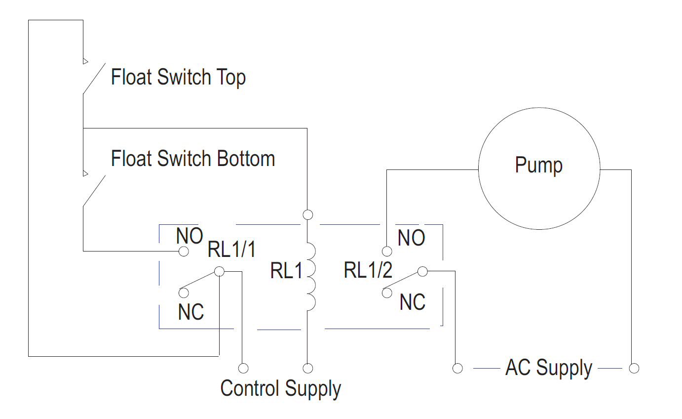 只要液體高于該開關(guān)點,底部開關(guān)將關(guān)閉。液體上升直到頂部浮動開關(guān)關(guān)閉并為繼電器供電。一組繼電器觸點將泵連接到電源,另一組繼電器保持繼電器接通狀態(tài),而電平則朝向底部開關(guān)。