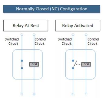 在常閉(NC)模式下,情況正好相反(如圖2所示)。 當繼電器處于靜止狀態(tài)(沒有電壓施加到控制電路)時,開關(guān)電路閉合,電流流過開關(guān)電路。 通過向控制電路施加適當?shù)碾妷簛砑せ罾^電器時,繼電器中的電磁線圈將激活并拉開開關(guān),從而阻止流經(jīng)開關(guān)電路的任何電流。 我不知道繼電器內(nèi)部的工作原理。