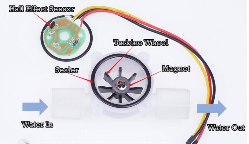內(nèi)部非常簡(jiǎn)單。主要組件是霍爾效應(yīng)傳感器,渦輪機(jī)葉輪和磁體。水通過(guò)入口流入,然后通過(guò)出口流出。水流帶動(dòng)車輪轉(zhuǎn)動(dòng),車輪上的磁鐵也隨之轉(zhuǎn)動(dòng)。磁場(chǎng)旋轉(zhuǎn)會(huì)觸發(fā)霍爾傳感器,該霍爾傳感器輸出高電平和低電平方波(脈沖)。